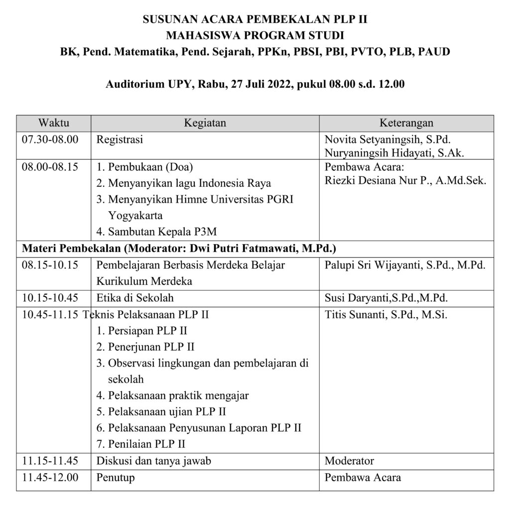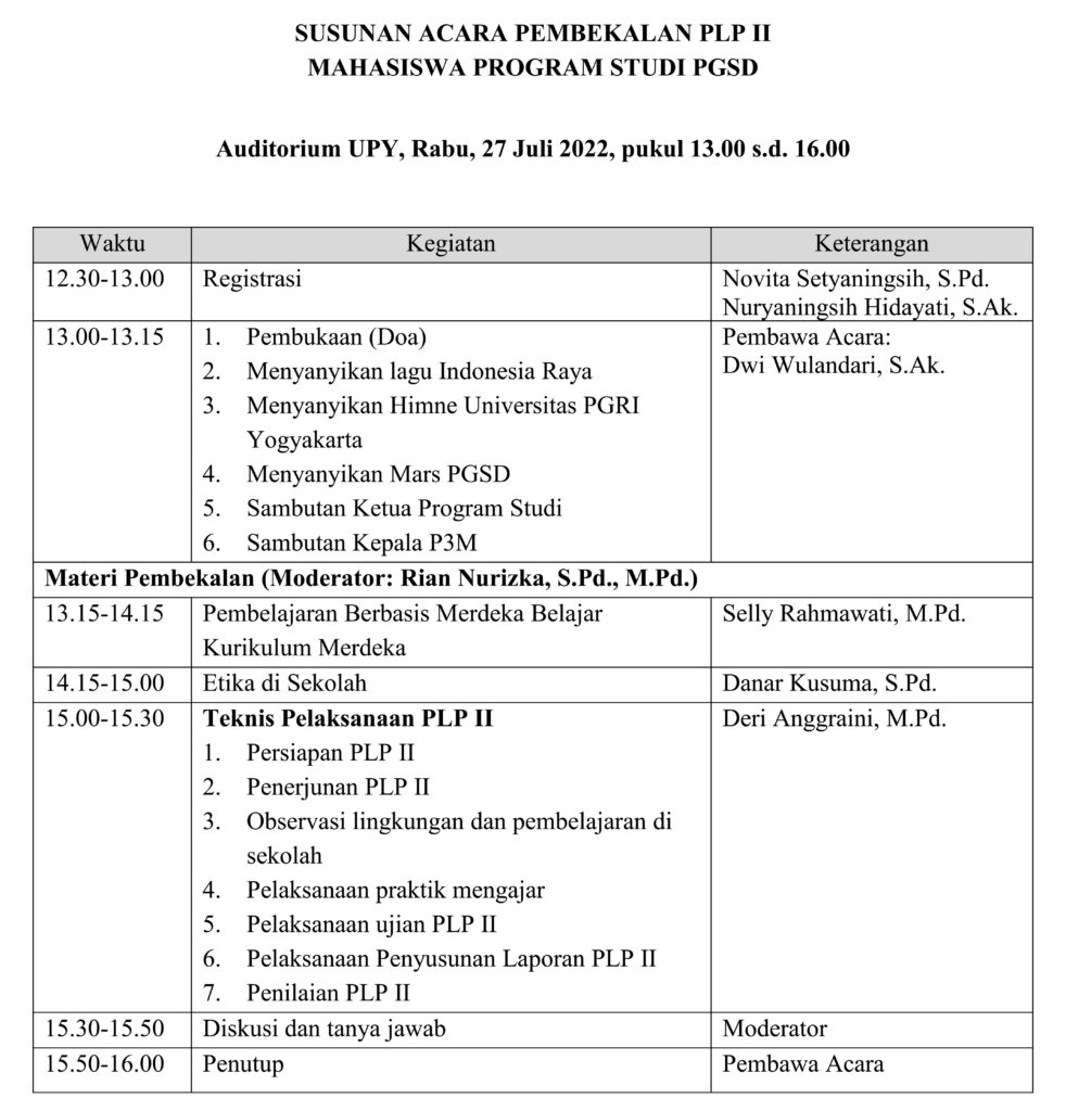 Jadwal dan Susunan Acara Pembekalan Mahasiswa PLP II