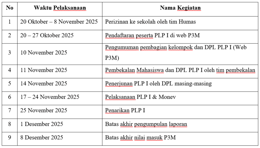 Jadwal pelaksanaan PLP I 2025